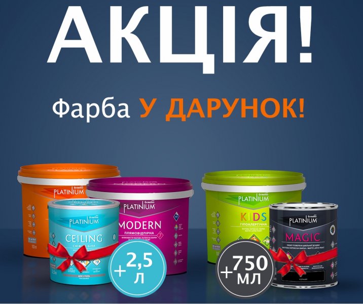 Таким чином, споживачі, які купуватимуть з 01 жовтня 2018 року по 31 жовтня 2018 року 10 л фарби Śnieżka PLATINIUM® MODERN або Śnieżka PLATINIUM® CLASSIC, отримають у дарунок фарбу для стель Śnieżka PLATINIUM® CEILING 2,5 л. Для покупців, які планують ремонт дитячої кімнати, доречною буде купівля 10 л фарби Śnieżka PLATINIUM® KIDS, відповідно вони отримають у дарунок фарбу з ефектом шкільної дошки Śnieżka PLATINIUM® MAGIC 750 мл. Це дасть можливість батькам створити цікаву творчу зону для дітей, які проводитимуть дозвілля з користю і неодмінно втілюватимуть свої найсміливіші ідеї.
