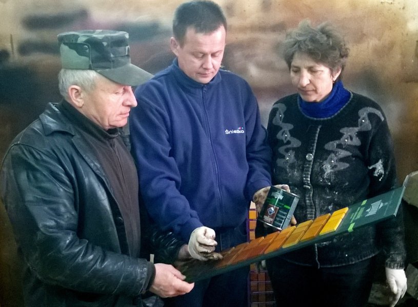 Під час навчання майстри, що займаються фінішною обробкою деревини на виробництві разом із фахівцями ТзОВ «Снєжка-Україна» випробовували на практиці продукцію (зеленої і фіолетової лінійок)ТМ VIDARON, наносячи їх на дерев'яні поверхні методом розпилення. Таким чином працівники деревообробного виробництва змогли оцінити якісні характеристики продукції, що відповідає європейським стандартам. Столярам особливо сподобалося працювати виробом «VIDARON Бейц для деревини», що створює на поверхнях будь-яких столярних конструкцій неповторний декоративний ефект.
