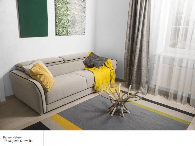 Монохромні інтер’єри завдяки своїй просторовій гармонії діють на нас заспокійливо. Білий ідеально поєднується з кольорами землі, створюючи спільно з бежевими, коричневими, синіми, сірими, зеленими барвами атмосферні, природні та ідеальні для відпочинку інтер’єри. Якщо ці кольори ввести у помешкання за допомогою натуральних матеріалів: деревини, полотна, рослин, – то в оселі пануватиме атмосфера скандинавського хюгге.
