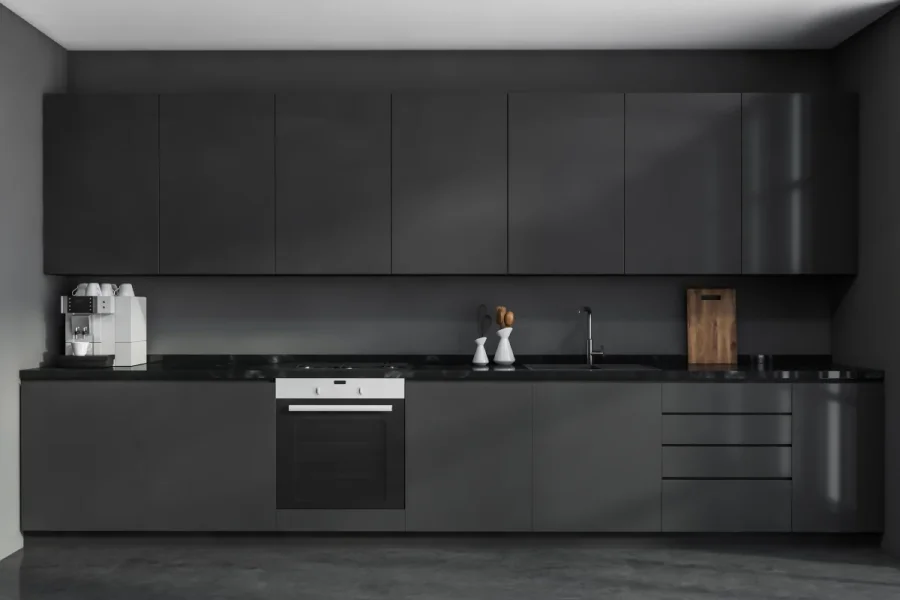 На кухні антрацитовий колір красиво відтіняє білі або дерев'яні фасади шафок. Він може бути присутнім на стіні, у вигляді стільниці, побутової техніки або меблевих ручок. Гарно працює також як колір кухонного острова.