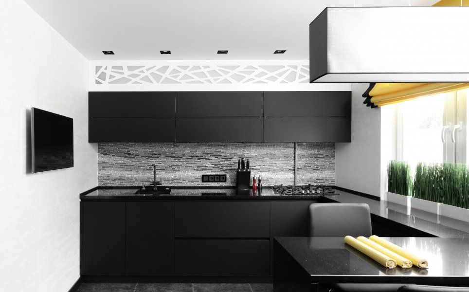 Чорний колір легко комбінується з іншими кольорами на кухні, однак не завжди гарно у ній виглядає. З особливою обережністю слід обирати чорний, коли приміщення невелике і в ньому мало денного світла. Чорний може, проте не обов’язково повинен візуально зменшити простір, правильне його застосування може дати ефект глибини і створити враження оптичного збільшення приміщення.