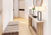 Прихожая – это место, где пол подвергается износу гораздо быстрее, чем в остальных комнатах, поэтому лучше, если хотя бы зона перед входной дверью будет выложена керамогранитом. От контакта со снегом и водой с мокрой обуви деревянный пол быстро портится, даже если он полакирован. Однако цвет керамогранита не должен контрастировать с интерьером. Мягкие светлые оттенки пола также будут способствовать визуальному увеличению пространства.