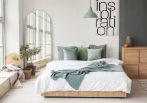 - Лёгкий, приглушенный светло-зелёный – весенние, но неяркие оттенки пастельной зелени, такие как шалфейный или оливковый, визуально осветляют спальню и при этом успокаивают эмоции.